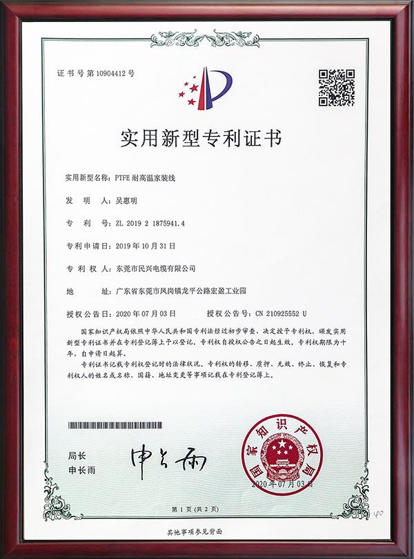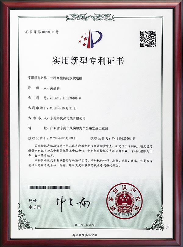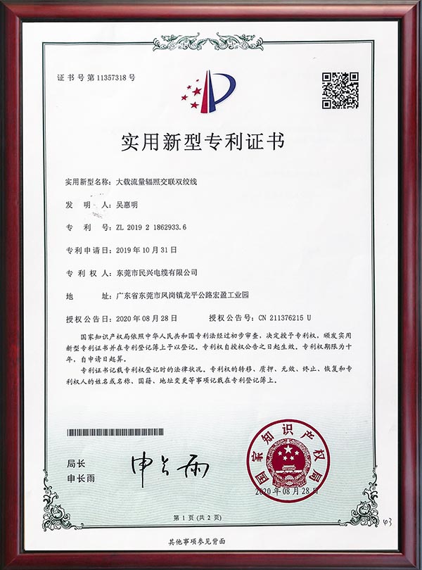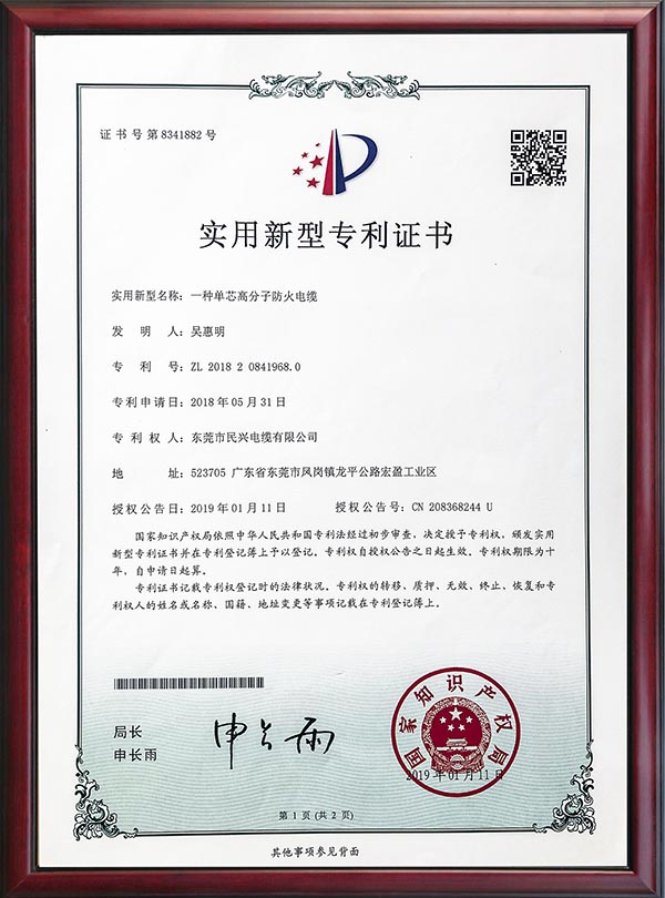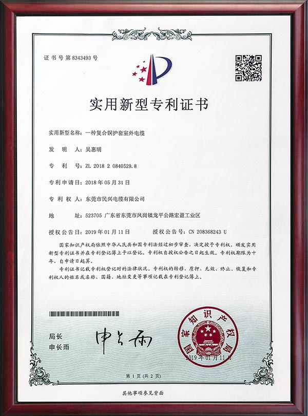 • 专利证书-扁平铜护套矿物质绝缘防火电缆