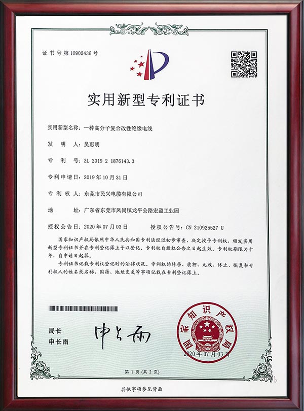 • 专利证书-低烟无卤高阻燃新型环保电缆