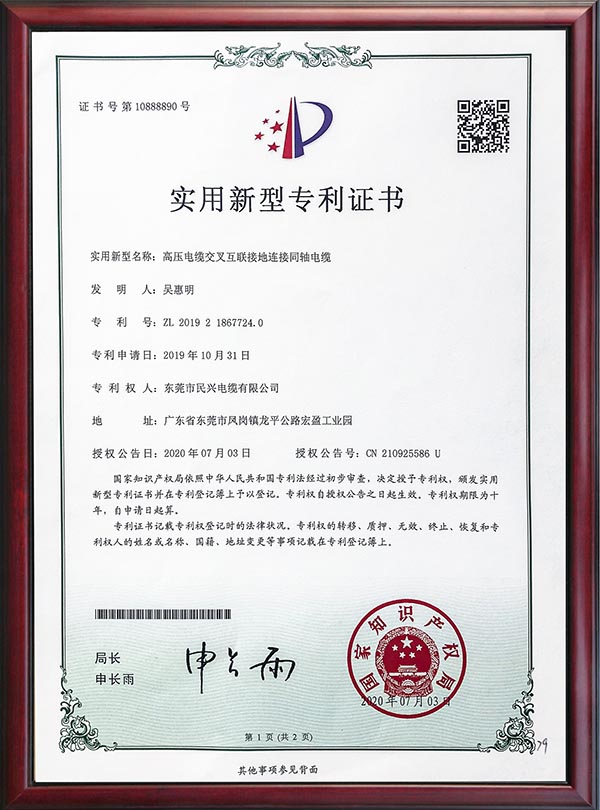 • 专利证书-高压电缆交织互联接地毗连同轴电缆