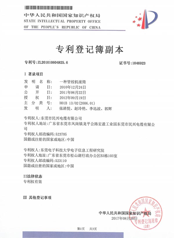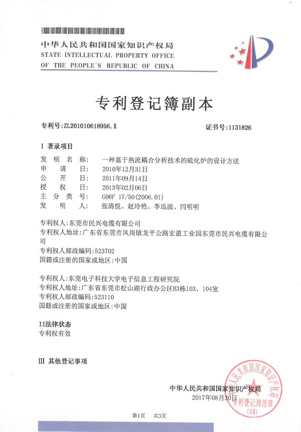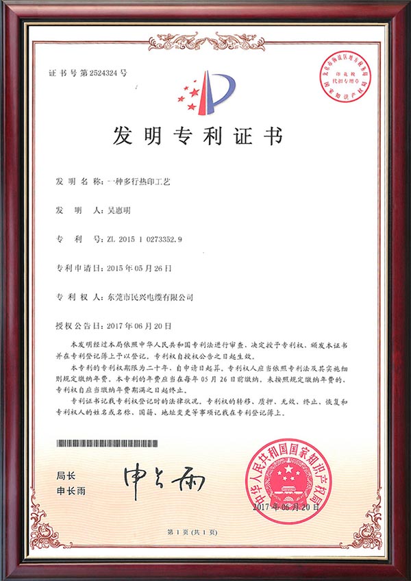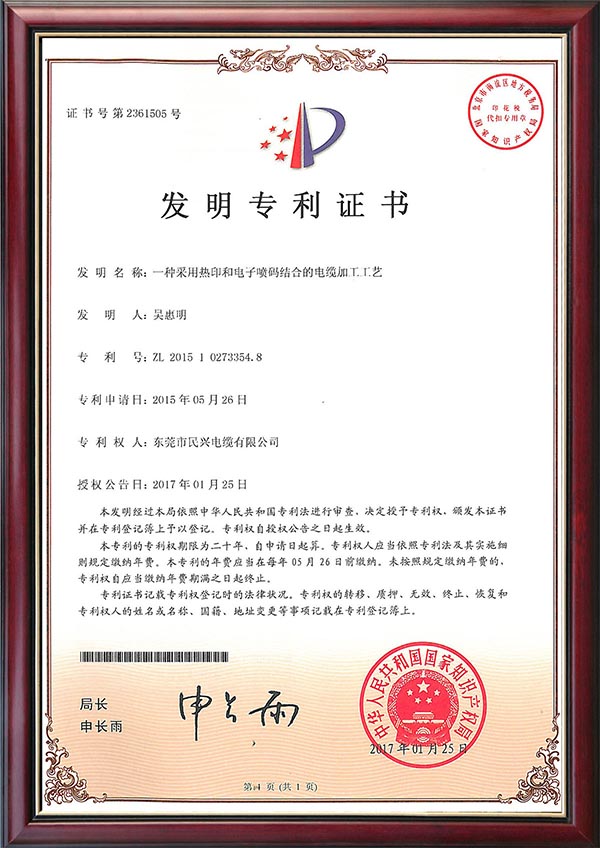 • 发明专利证书--一种接纳热印和电子喷码团结的电缆加工工艺